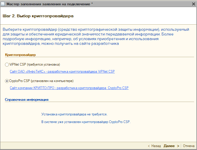 Далее система определит какое СКЗИ (средство криптографической защиты информации) установлено на компьютере. Если на компьютере уже установлено СКЗИ, информация об этом отобразится в разделе Справочная информация. Если ни одна из программ не установлена, выберите программу, которая будет использована для подписи и шифрования документов отчетности и перейдите на сайт разработчика данной программы для загрузки: