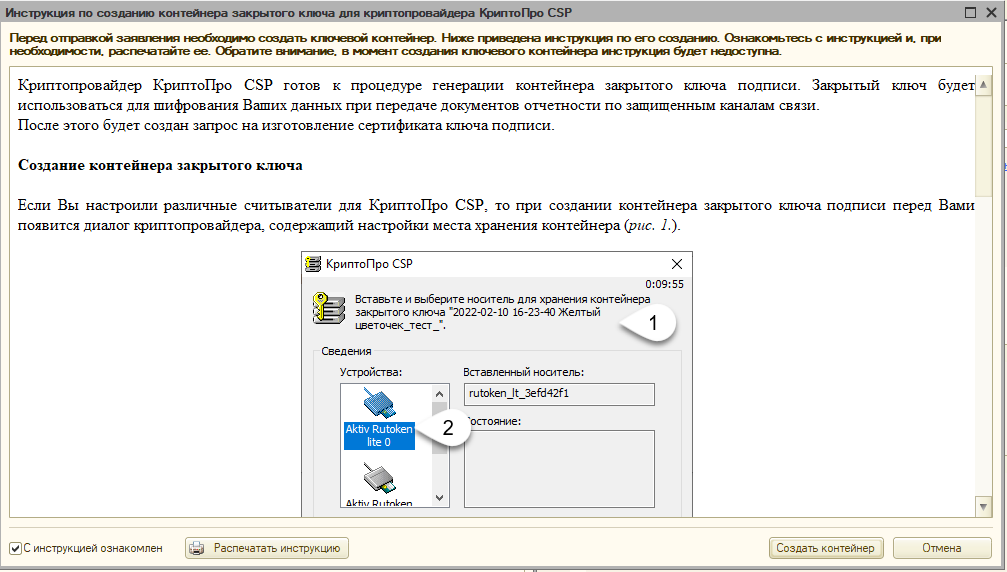 При нажатии кнопки Отправить... откроется инструкция по созданию контейнера закрытого ключа. Ознакомьтесь с инструкцией, установите флажок С инструкцией ознакомлен и нажмите кнопку Создать контейнер: