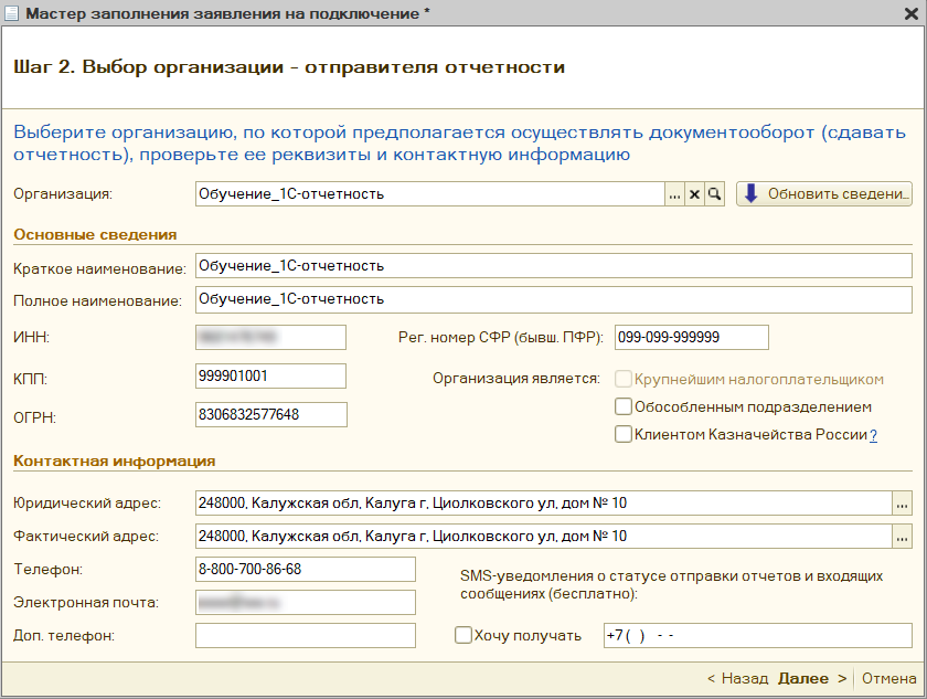В следующем окне проверьте корректность информации об организации, для которой необходимо сформировать заявление: