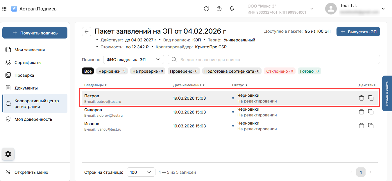 Чтобы заполнить заявление, перейдите в раздел Корпоративный центр регистрации. Откройте пакет заявлений и нажмите на нужное заявление: