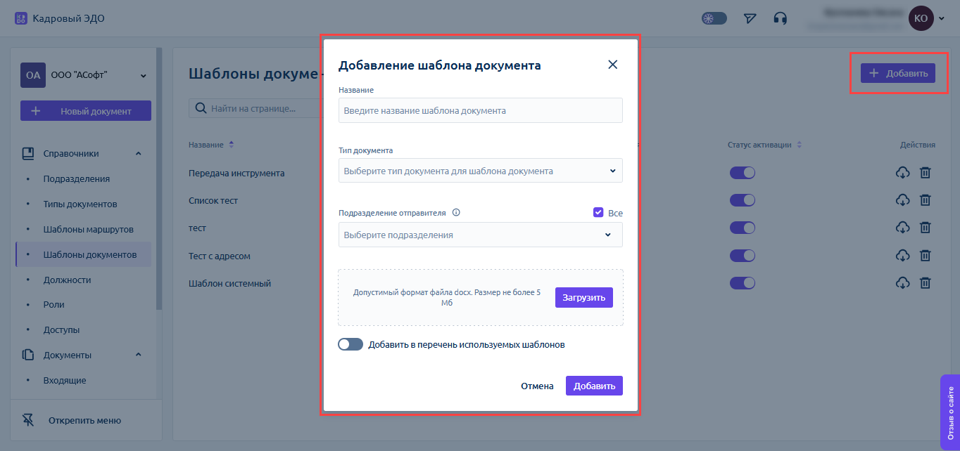 Для загрузки шаблона документа перейдите в Справочники → Шаблоны документов и нажмите кнопку Добавить. Введите название документа, из выпадающего списка выберите тип документа, подразделение отправителя и загрузите файл:
