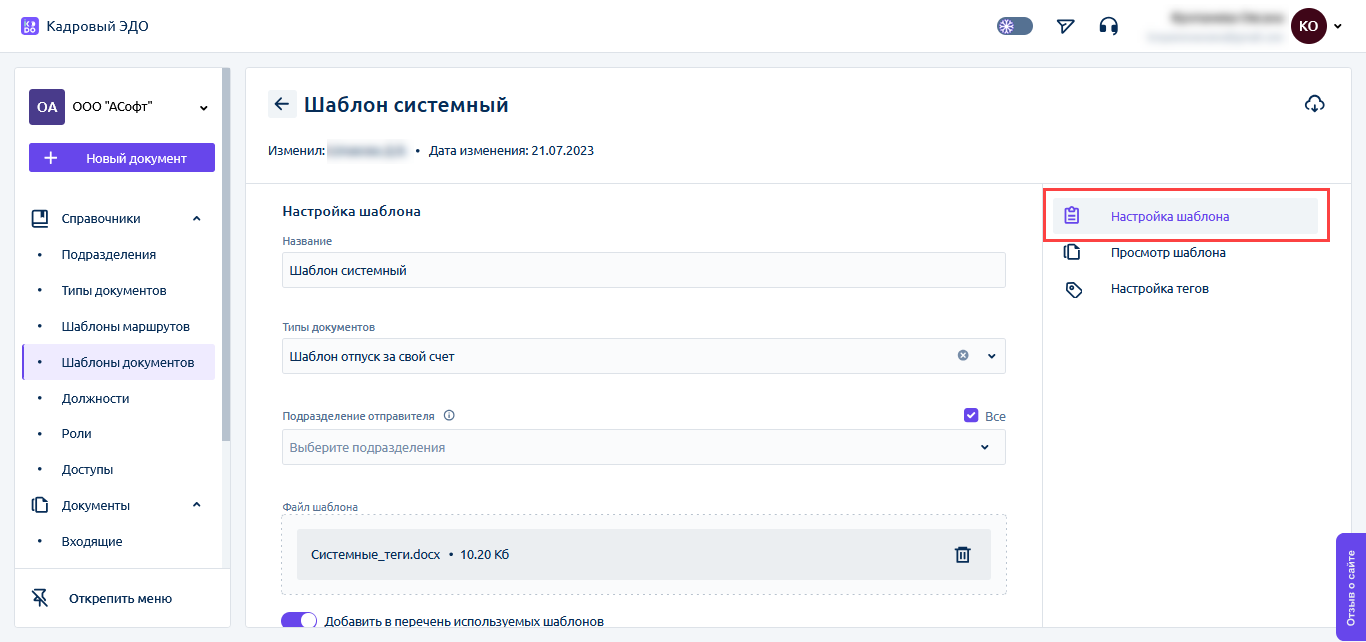 Для настройки шаблона документа откройте нужный шаблон из списка. В разделе Настройка шаблона можно изменить название, тип документа и выбрать подразделение отправителя: