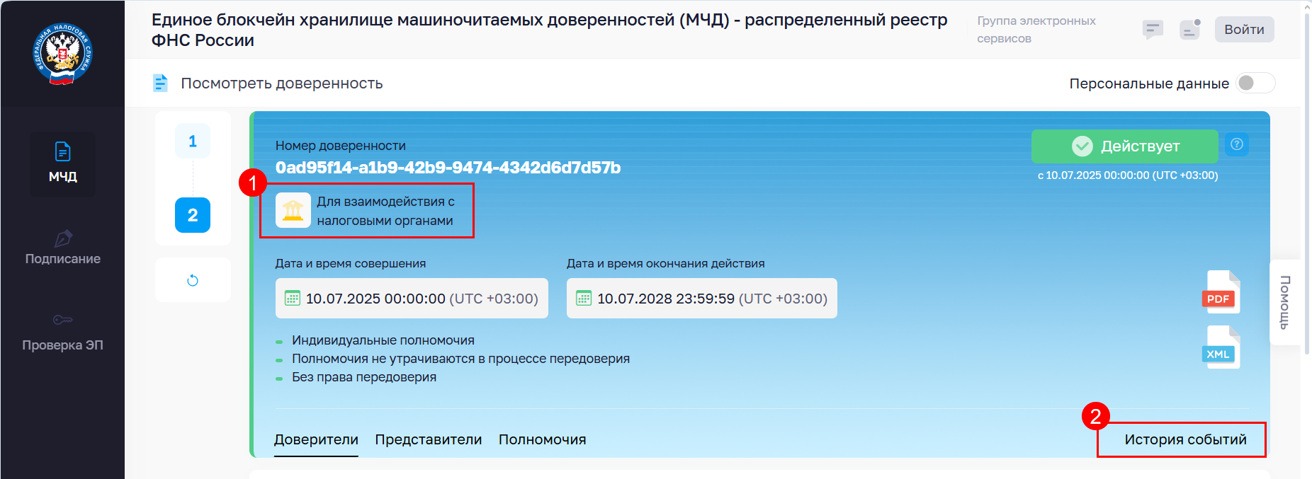 При проверке должно быть указано: "Для взаимодействия с налоговыми органами" (1). В Истории событий (2) не должно быть ошибок: