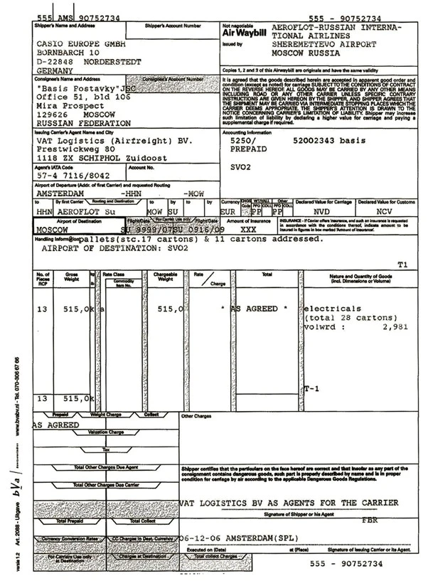 Авианакладная, как и коносамент, подтверждает договор перевозки и прием груза, но у документов есть одно ключевое различие: коносамент является товарораспорядительным документом (дает право собственности на груз), в то время как авианакладная таким документом не является — груз выдается лицу, указанному в графе «получатель», по подтверждению его личности, без необходимости предъявлять оригинал самой авианакладной.
