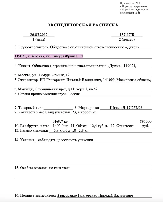 Форма документа установлена Приказом Минтранса от 11.02.2008 № 23. Заполненная экспедиторская расписка должна содержать следующую информацию