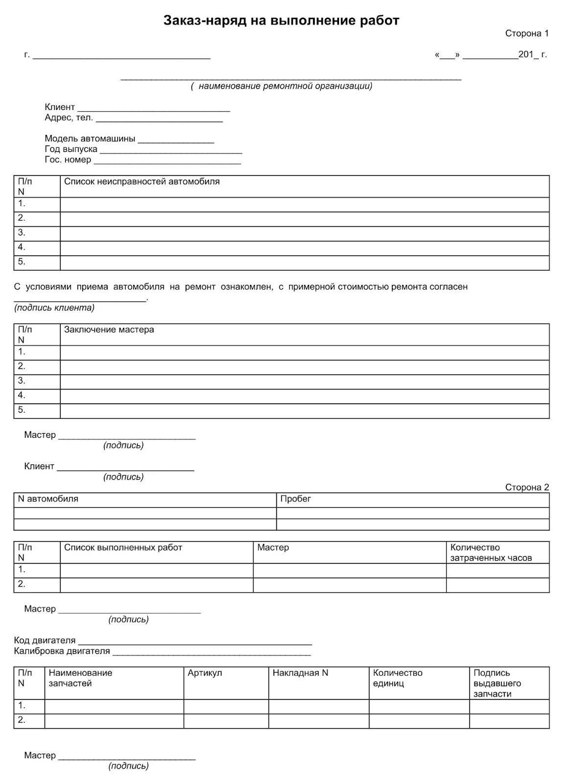 Например, если нужно оформить заказ на ремонт бытовой техники и электроприборов, или на обслуживание и ремонт автомобилей, на изготовление мебели или другую подобную услугу, используется форма БО-1. В ней три части: непосредственно заказ-наряд с указаниями по заданию; бланк с информацией, которая передаётся бухгалтеру; бланк с гарантийным талоном — квитанцией, которую получают заказчики.
