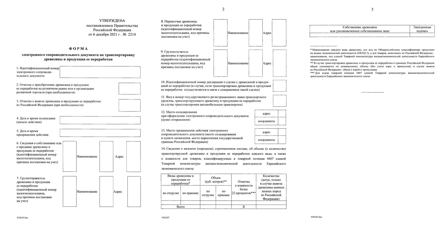 Оформление и оборот древесины регулируются Лесным кодексом РФ (ст. 50.4) и Постановлением Правительства РФ № 2214. Согласно этим нормам, сопроводительный документ на транспортировку древесины должен быть сформирован до начала движения транспортного средства. Законодательство четко определяет, какая форма должна использоваться, какие данные в нее вносить и кто несет ответственность за оформление.