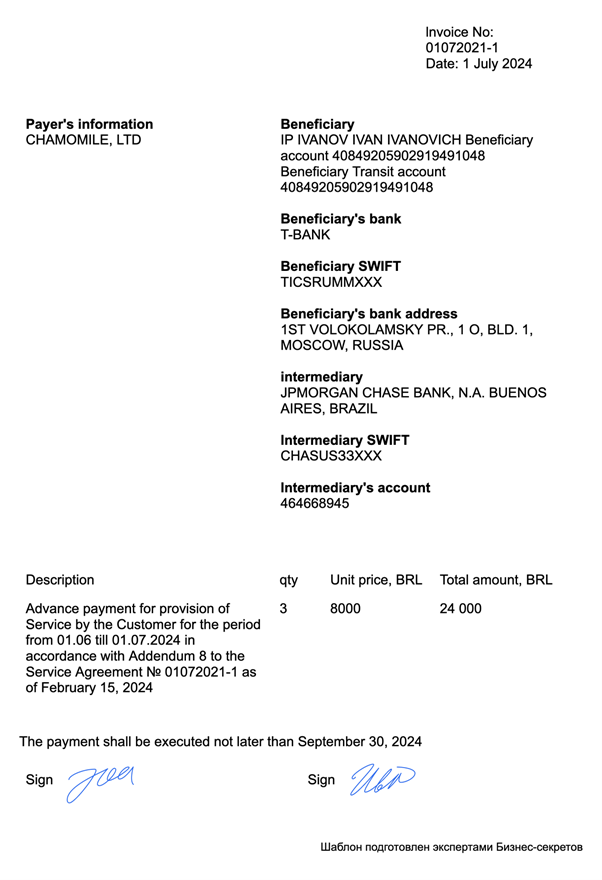 Чтобы оформление прошло успешно, инвойс должен содержать обязательные данные: