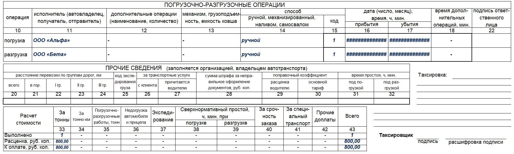 В предпоследнюю таблицу водитель вносит все прочие сведения (километраж, стоимость поездки, штрафы за неверно оформленные документы, время простоя). Данные в строках «Расчёт стоимости» и «Таксировка» вписывает бухгалтер перевозчика.