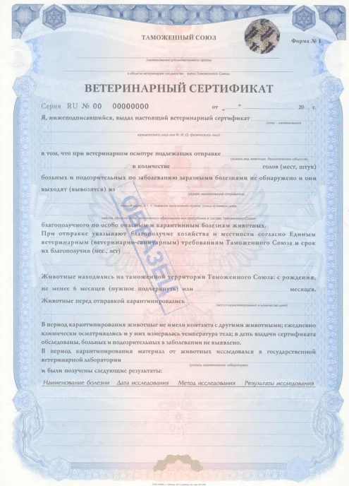 При пересечении границы международный ветсертификат обменивается на ветеринарное свидетельство Формы №1 российского образца.
