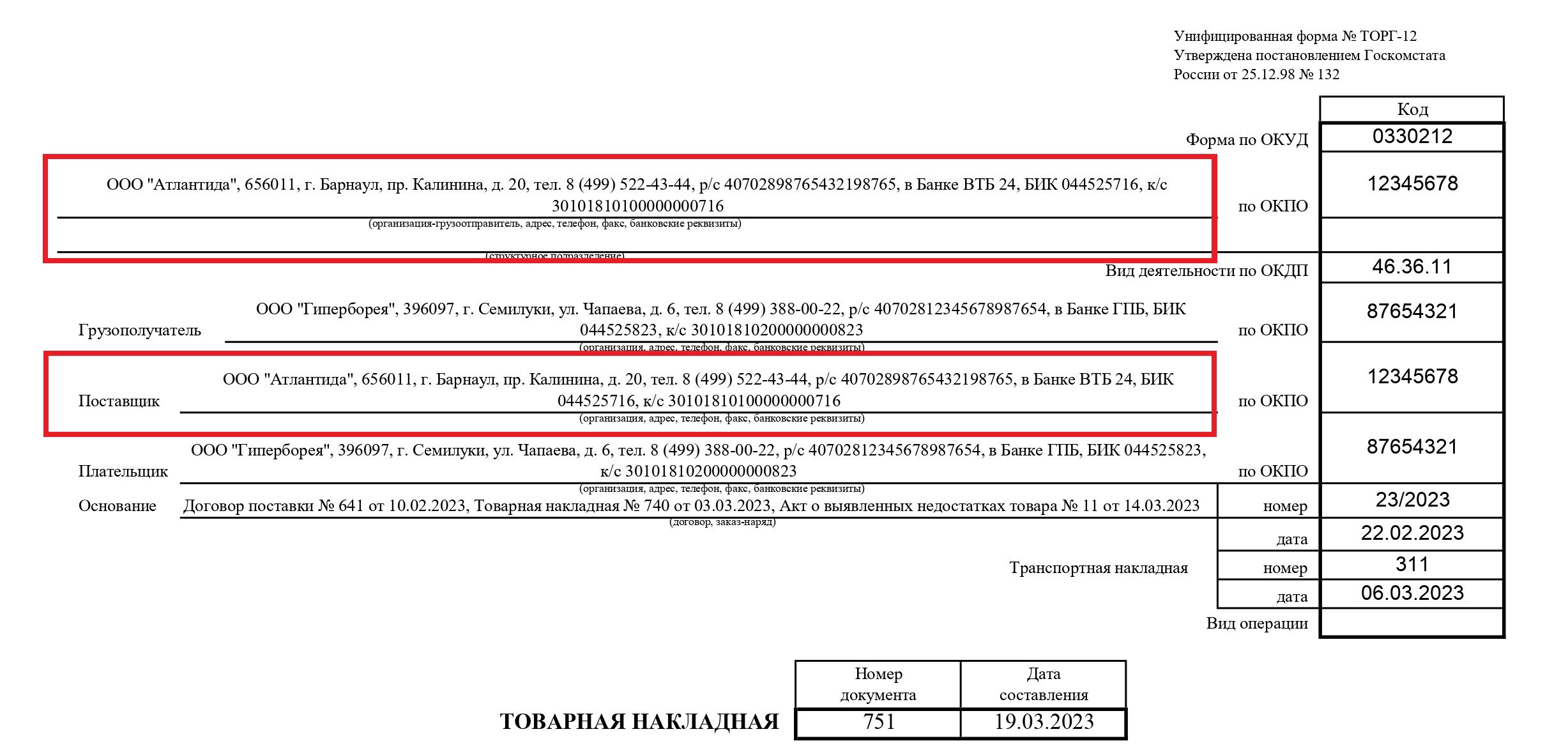 Поставщиком и грузоотправителем при возврате товаров выступает покупатель по договору. Наименование, адрес и банковские реквизиты указываются в соответствующих графах. При этом данные грузоотправителя заполнять необязательно.