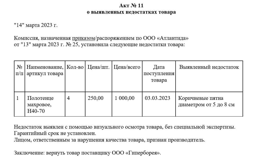 При возврате некачественного или некомплектного товара составьте акт о выявлении скрытых недостатков и претензионное письмо.