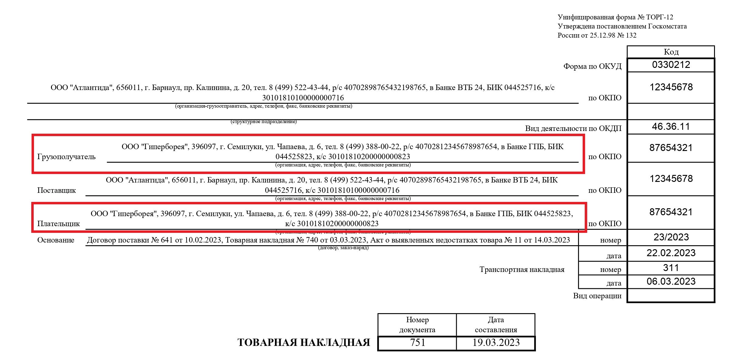 В графе «Грузополучатель» указываются наименование и реквизиты поставщика по договору. Он же является и плательщиком, если покупатель возвращает оплаченную продукцию и намеревается получить обратно деньги. Если возврат денег не предполагается, графу «Плательщик» можно не заполнять.