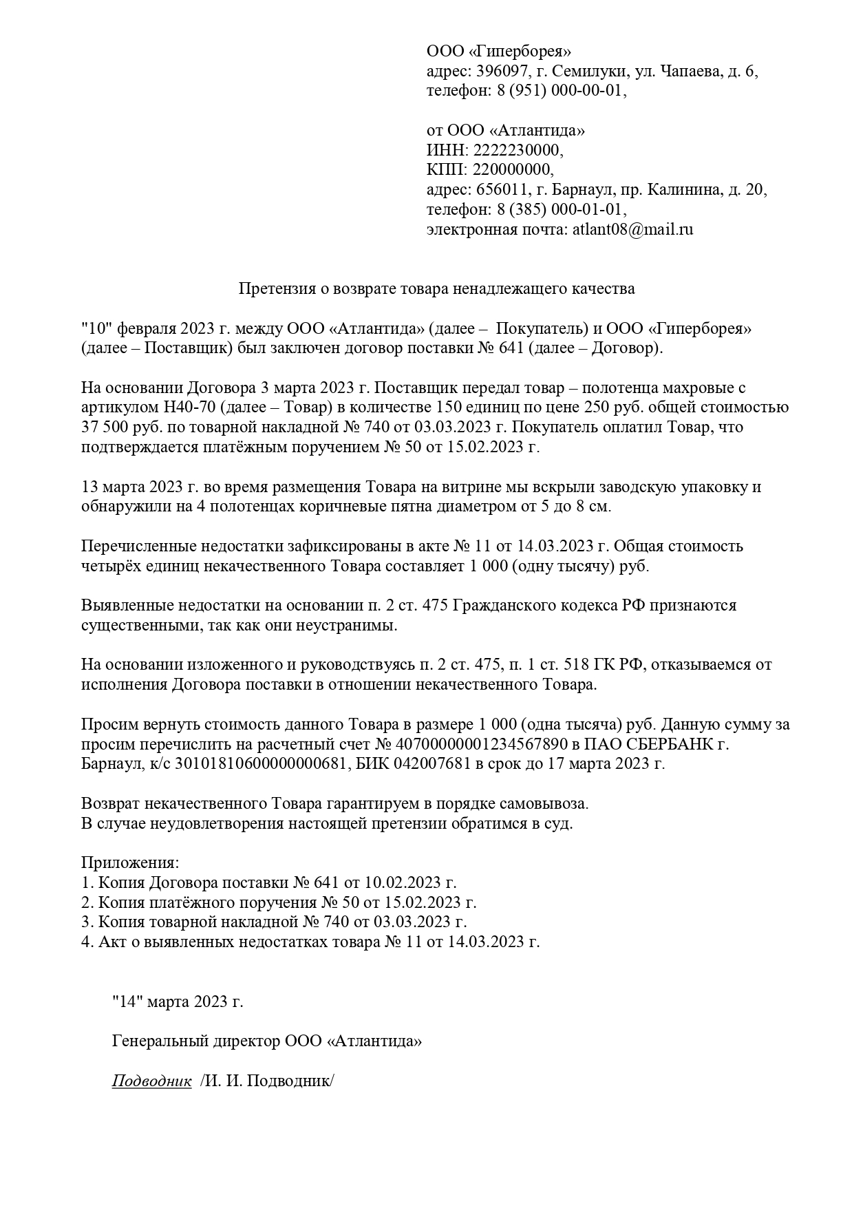 Письмо с претензией также можно составить в свободной форме. Важно указать в документе причину возврата товара, срок и другие условия возврата, а также способ перевода платы за бракованную продукцию обратно на ваш счет. Стоимость товара можно указать с учетом НДС.