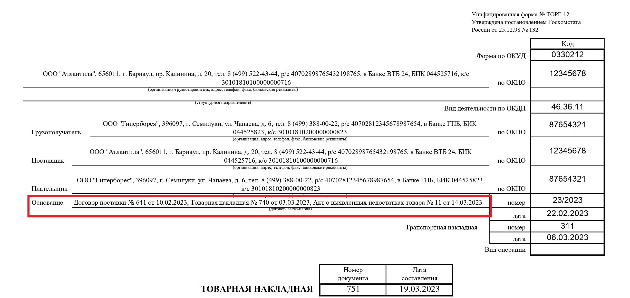 Графа «Основание» — самая важная в возвратной накладной. Здесь нужно указать содержание операции — «Возврат товаров», а также подробно перечислить: