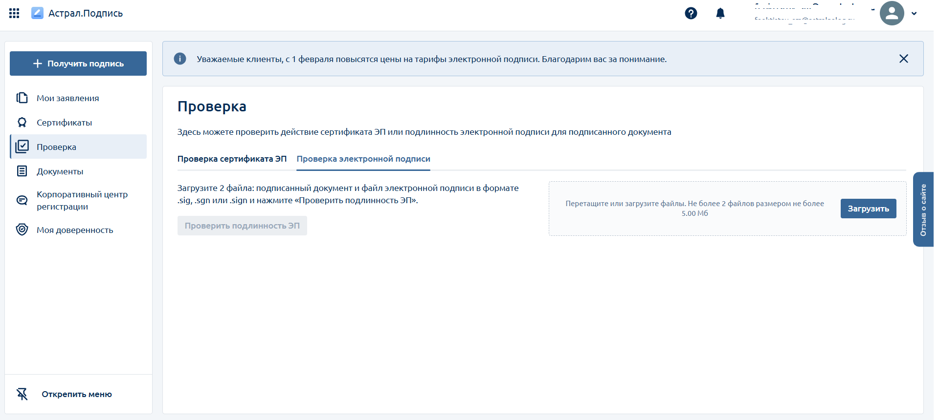 Есть ситуации, когда пользователю нужно убедиться в подлинности подписи. Для этого в обновлённом личном кабинете есть функция «Проверка подписи».