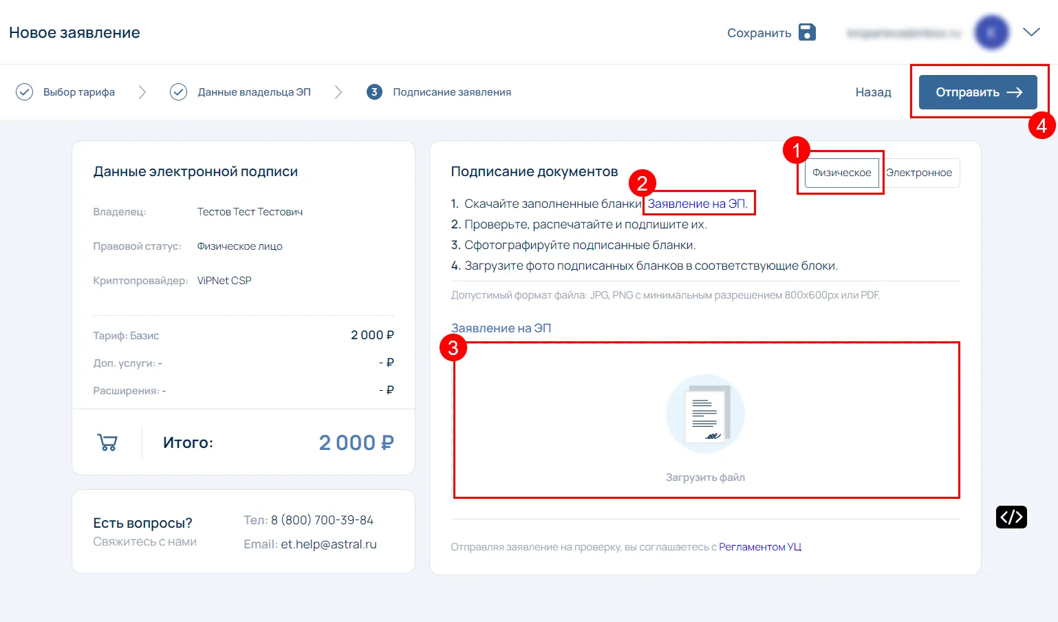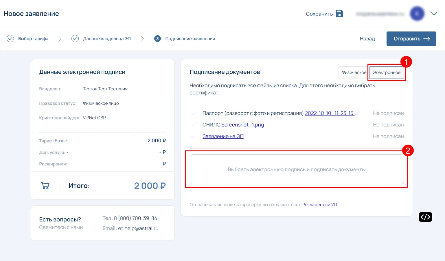 - Выберите «Электронное» (1) и выберите действующий сертификат УКЭП (2).