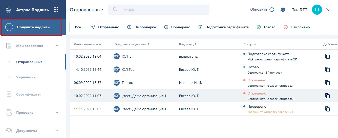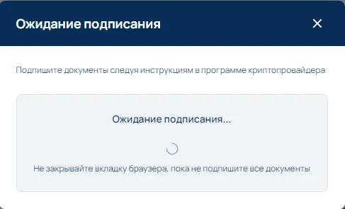- После того как контейнер будет сформирован, заявление будет отправлено на проверку в удостоверяющий центр. Нужно немного подождать, пока статус не поменяется на «Подпишите сертификат». Это означает, что ваше заявление одобрено.