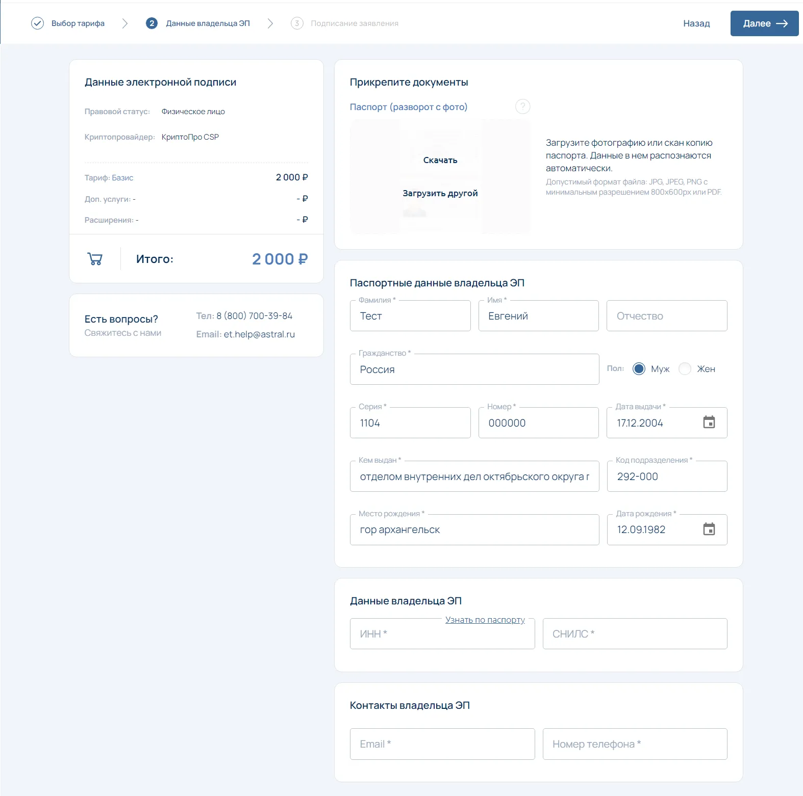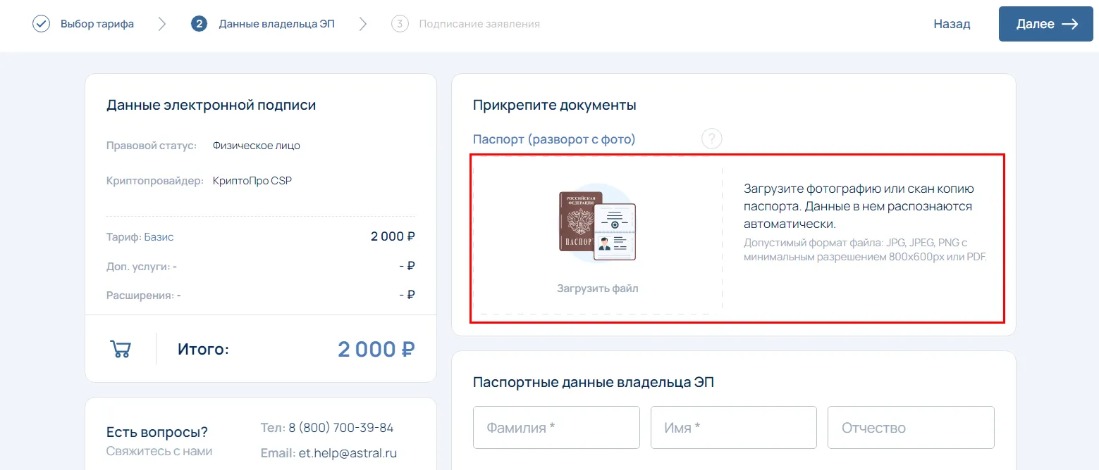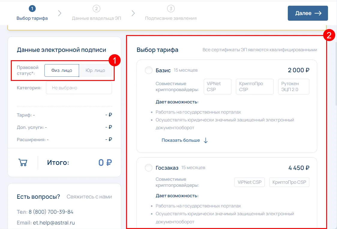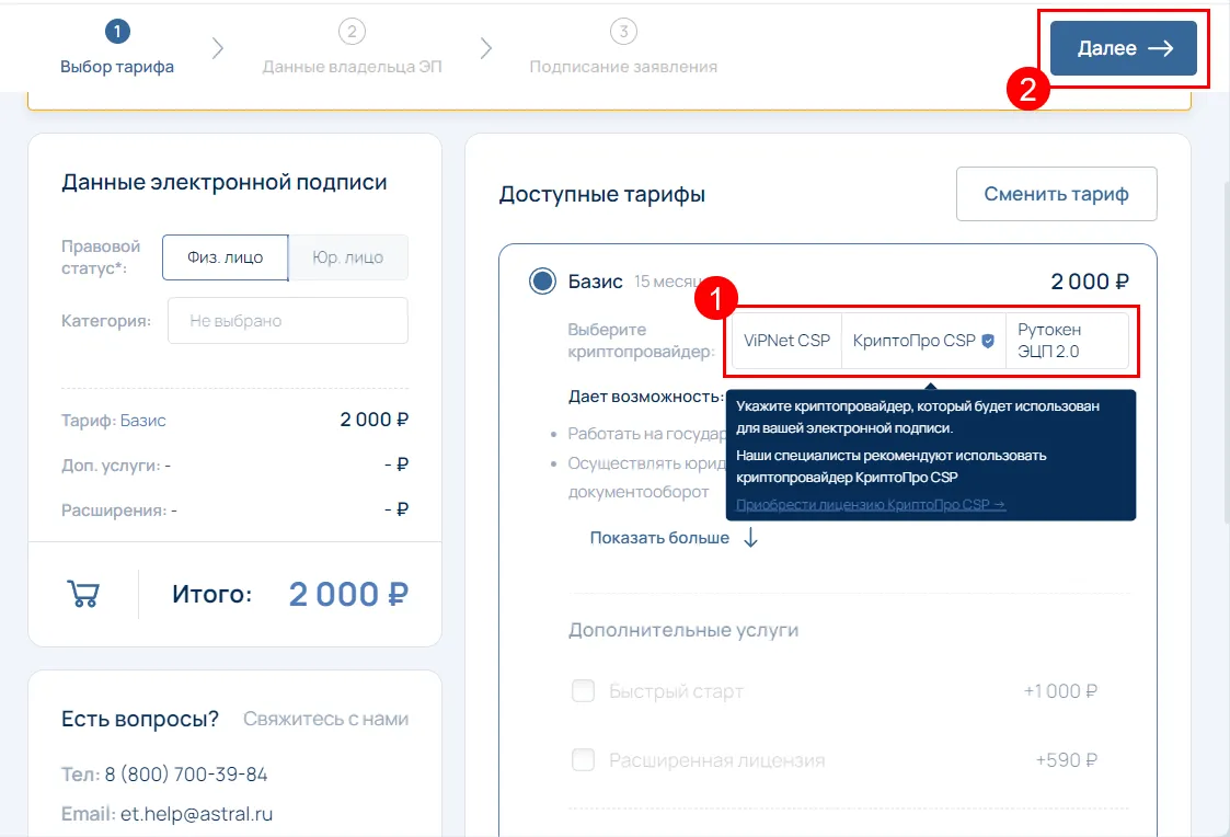 - Выберите тариф, криптопровайдер (1) и нажмите «Далее» (2).
