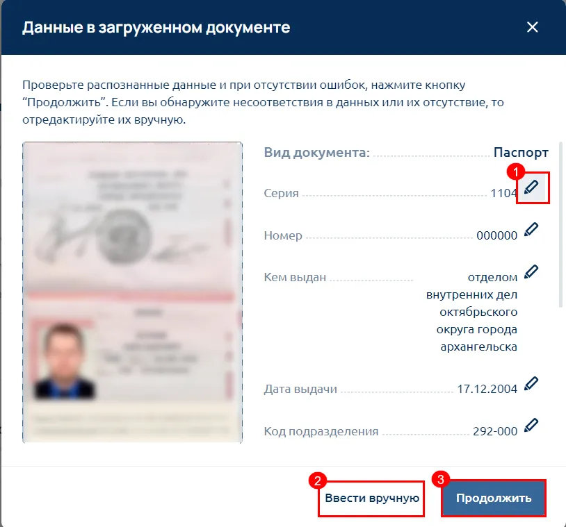 - Проверьте данные о физлице. В случае ошибки их можно отредактировать (1) или ввести вручную (2). Если информация правильная, нажмите «Продолжить» (3).