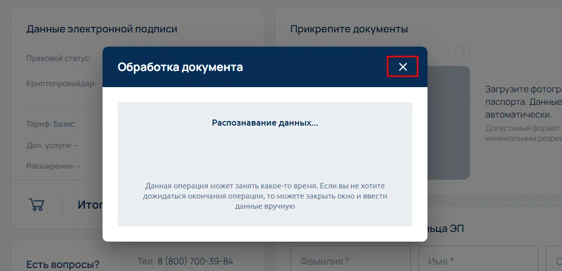 - Начнётся автоматический процесс распознавания и заполнения предоставленных данных. Если хотите прервать этот процесс и заполнить поля вручную, просто закройте окно.