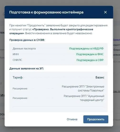 - После отправки исправить заявление не получится. Для формирования контейнера закрытого ключа нажмите «Продолжить».